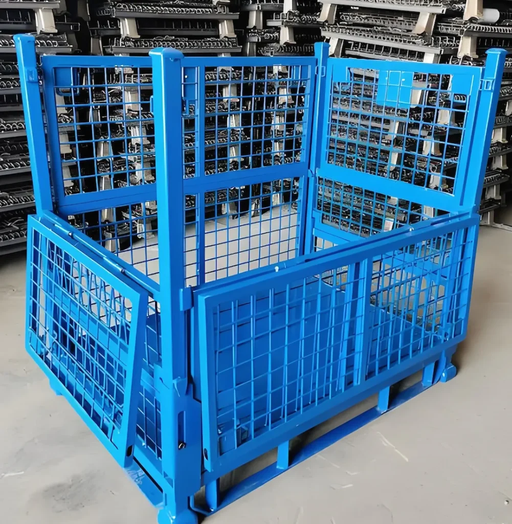 Fold-down cages reduce empty-return volume; hinges and latches are engineered for repeated cycles.